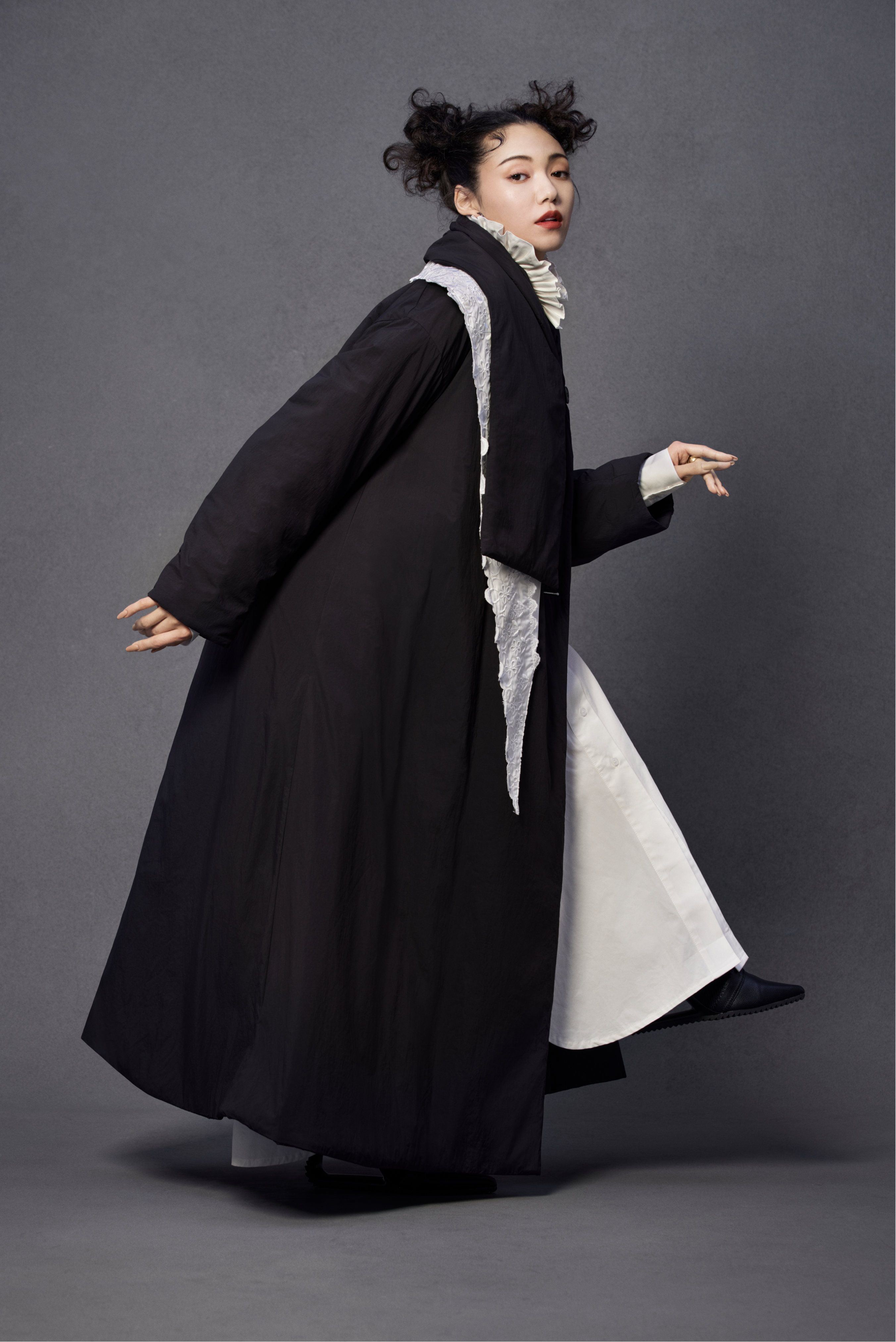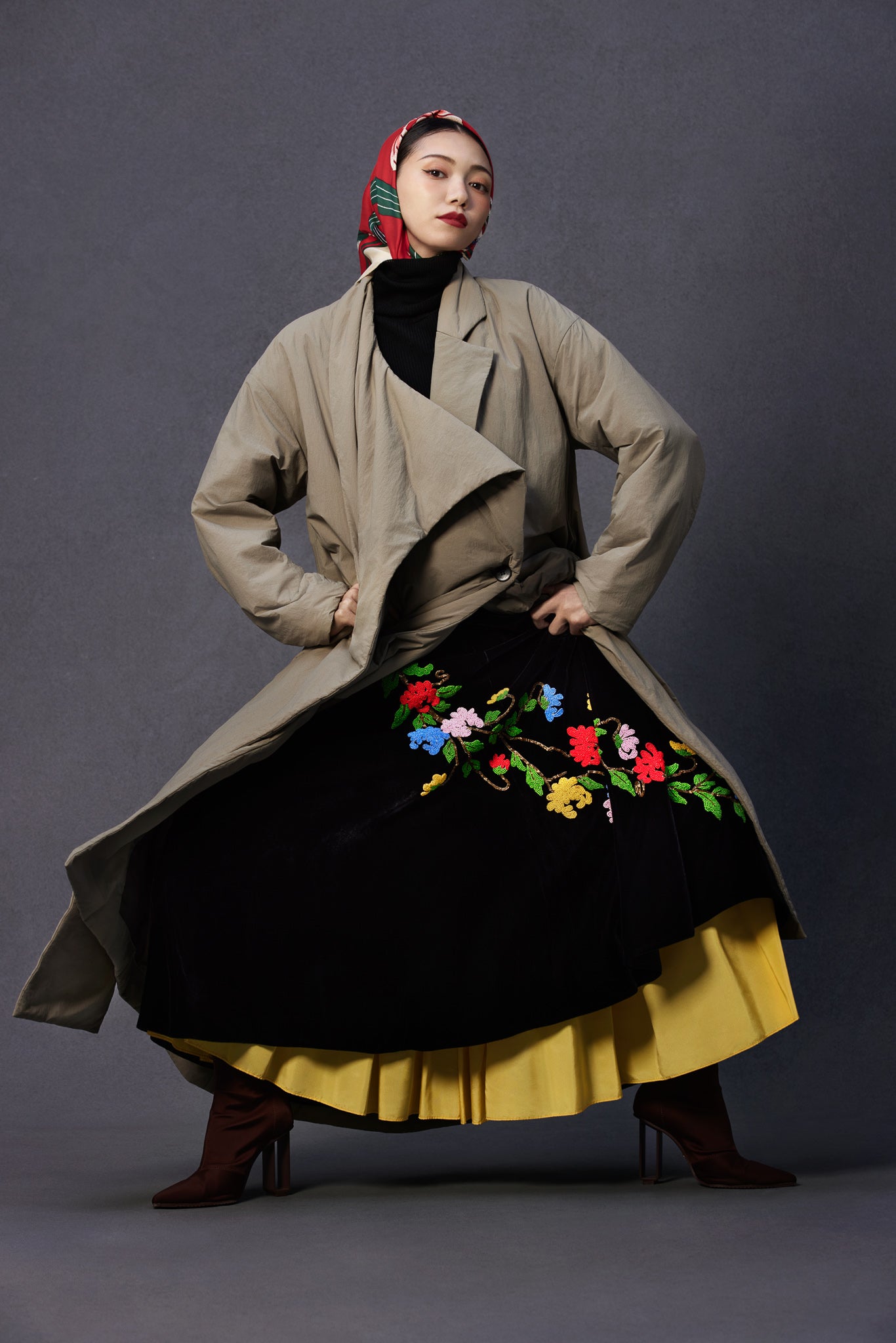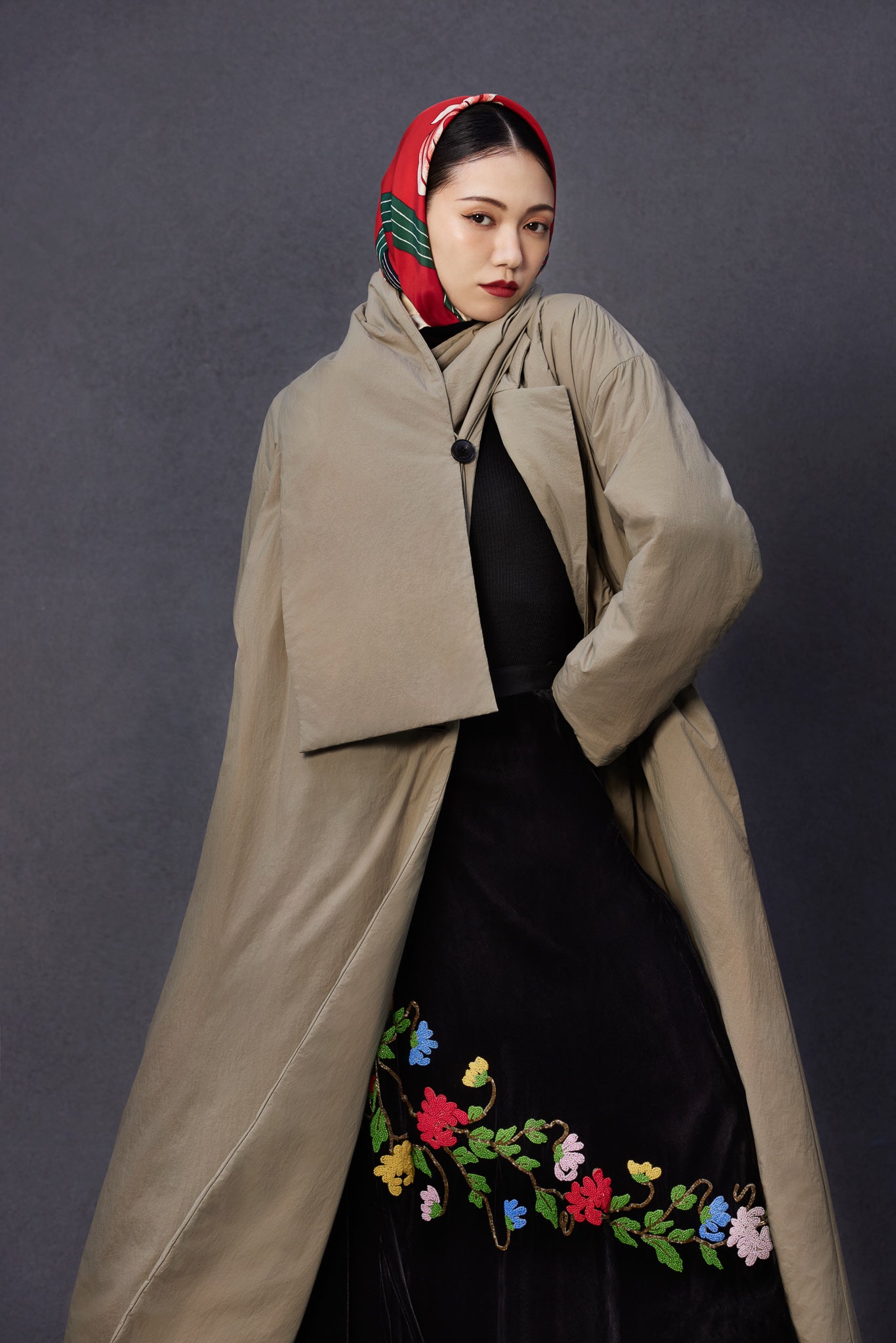 コートにマフラーをミックスした変形デザインコート。マフラー部分を首に巻いても垂らしてもよく、ビックシルエットなのユニセックスで着用でき、モードな装いになる一着。表地には程よい表面の立体感のある植物染料で染めたナイロン、中綿にはたった5mmでダウンの暖かさを持つ「Ethical Down Kapok」を使用しています。