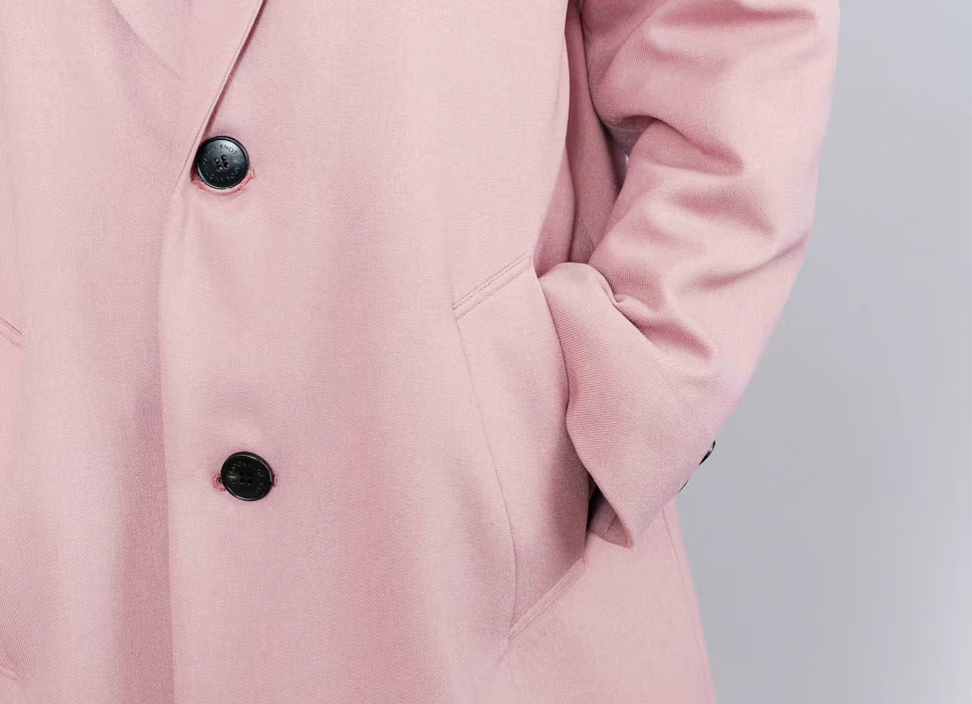 A worsted-style Chester coat made of wool-like polyester that is soft to the touch.