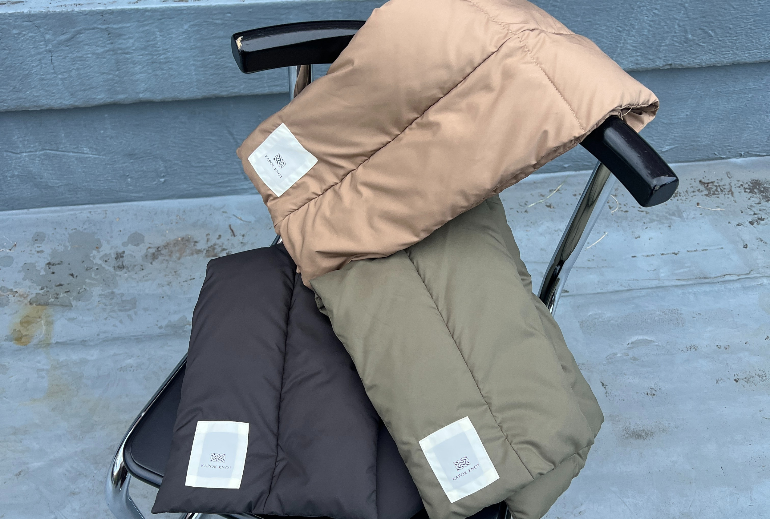 KAPOK KNOTのロゴがプリントされたワンポイントデザインで、冬の首元の印象をガラッと変えられます。