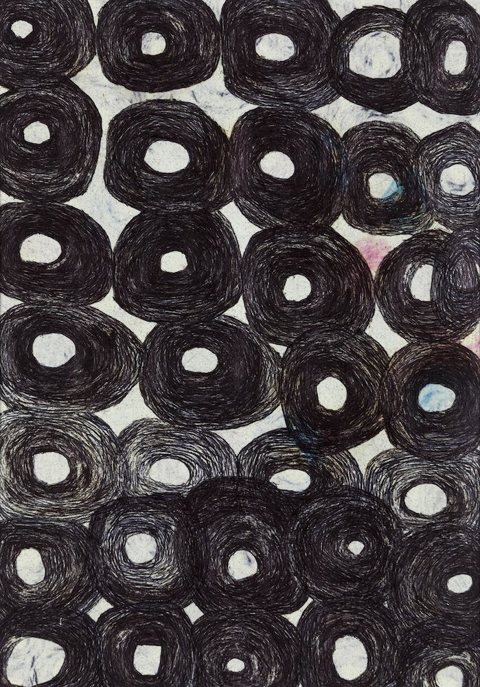 クーピーペンシルやクレヨンを塗り重ねることで作り上げられた作品は、一見すると、素早い鉛筆の動きを要する激しい制作態度を連想させる。しかし実は、彼女の制作は非常にゆっくりと穏やかである。彼女の描き出すひとつひとつの色は、お互いに交じり合うことなく、それぞれにその美しさを主張しながら画面の上に現れ、激しさと静けさが不思議に同居しており、心を惹きつけられずにはいられない。