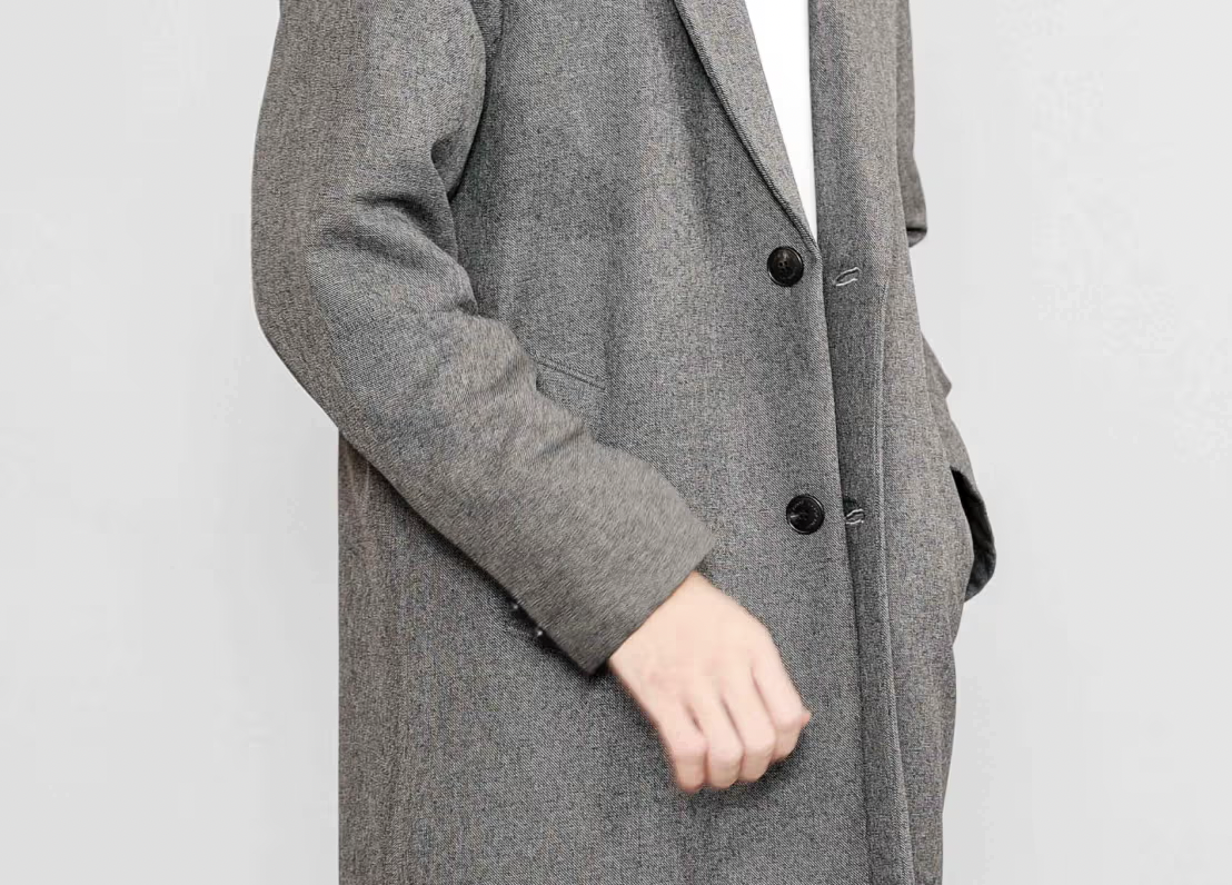 ウールライクなポリエステルを使用し梳毛調のチェスターコート。ゆったりとしたシルエットだが、かっちりした大きめの襟で、程よいカジュアル感とクラシック感を演出し、老若男女関係なく着れる一枚になります。ウールのようにチクチクせず、シワになりにくく手洗いできるイージーケアな素材を使用しています。レディースモデル: 177cm, メンズモデル: 183cm