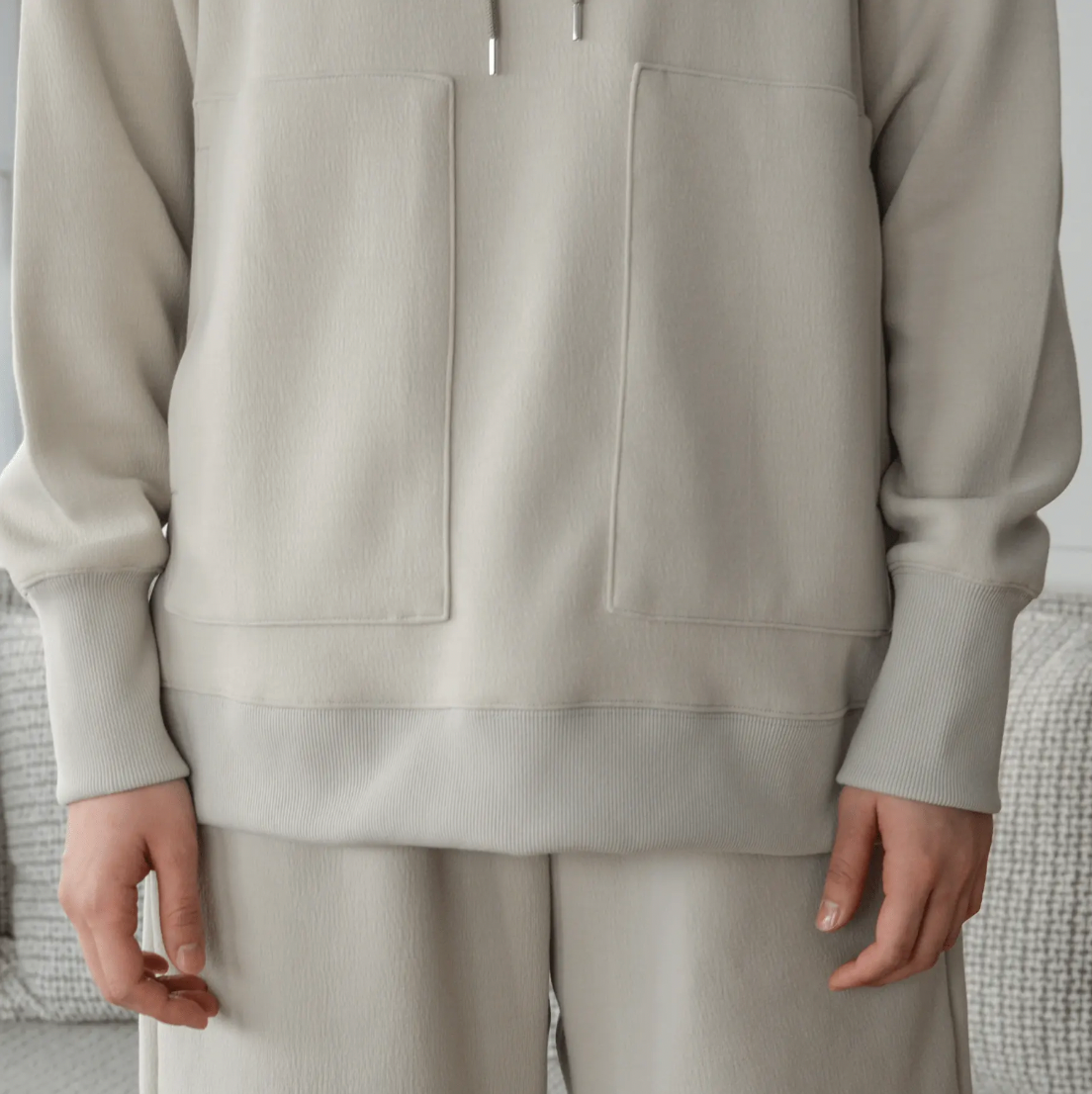 リサイクルポリエステルでできたハリのある生地「ダンボールニット」を使用した、シックなパーカー。