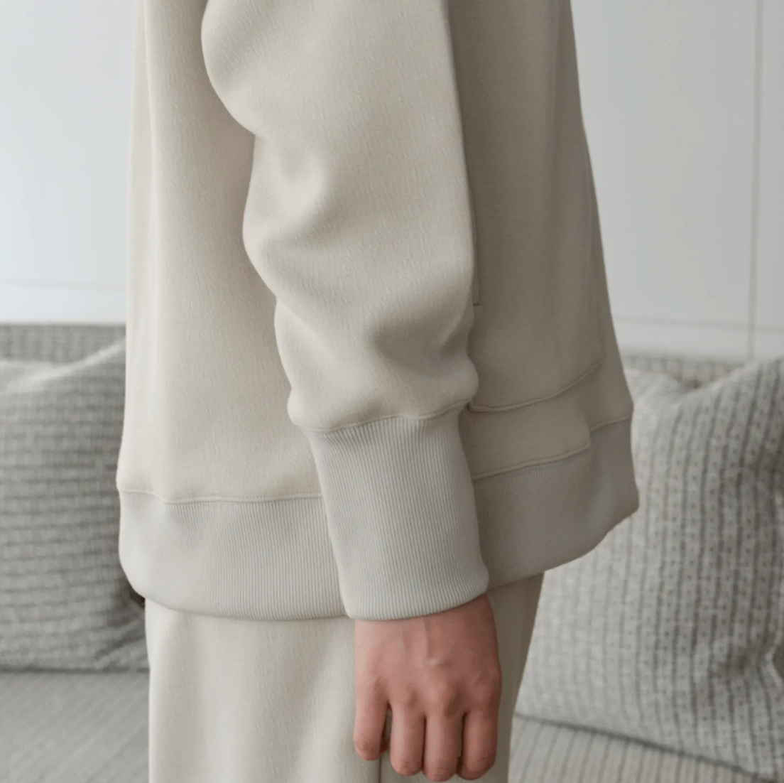 動きやすいスウェット素材ながらも光沢感のある上質な雰囲気で、家の中はもちろん、オフィスや旅行移動でも映えるデザイン。