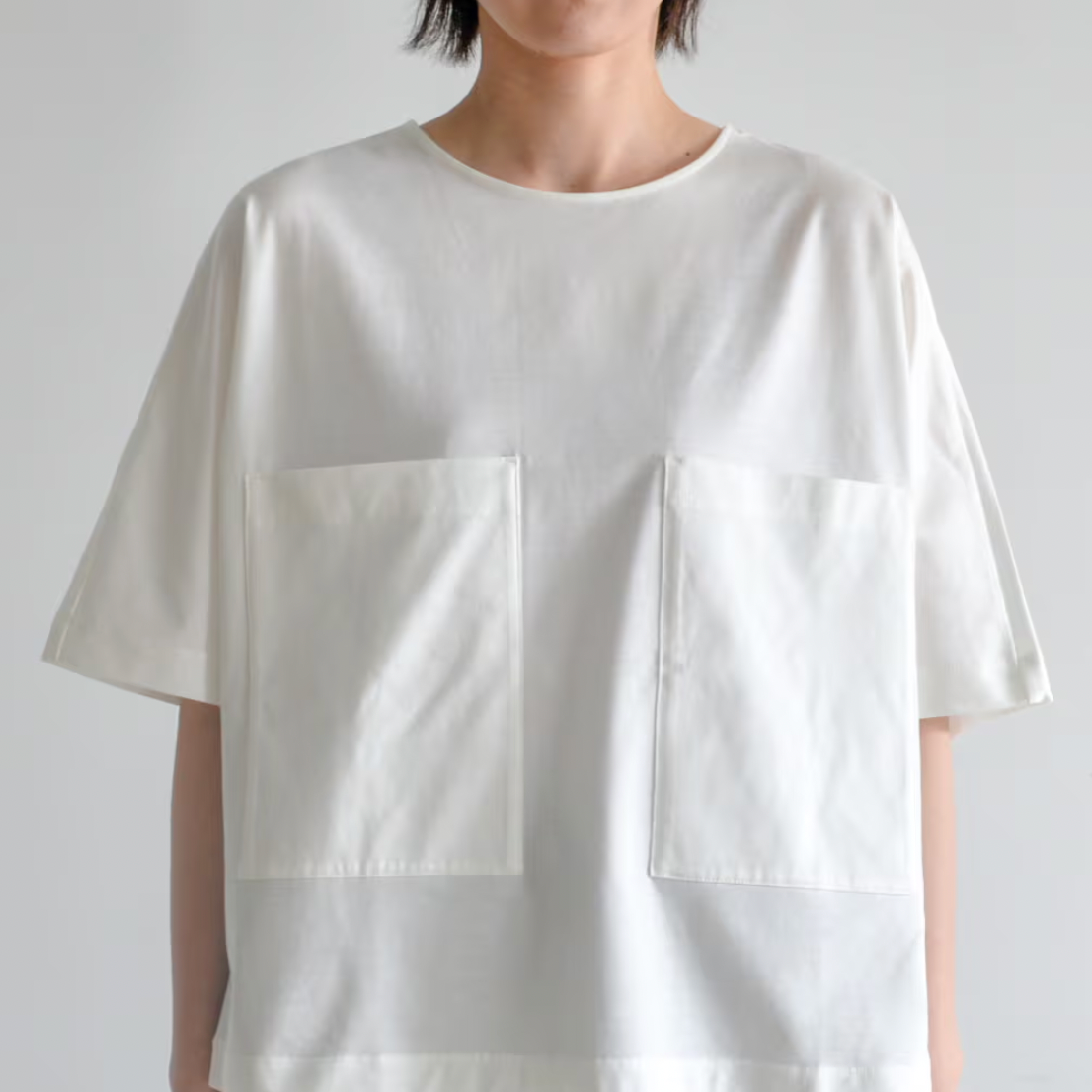胸元の2つのポケットが目をひく、オーバーシルエットのTシャツ。大きな四角形が幾何学模様に見える、モダンなデザイン。バックの襟元についたボタンが、ブラウスのようで上品な後ろ姿に。滑らかな肌ざわりと強度を持ち合わせた素材「ギザコットン」は着心地がよく、長く着用いただけるアイテム。